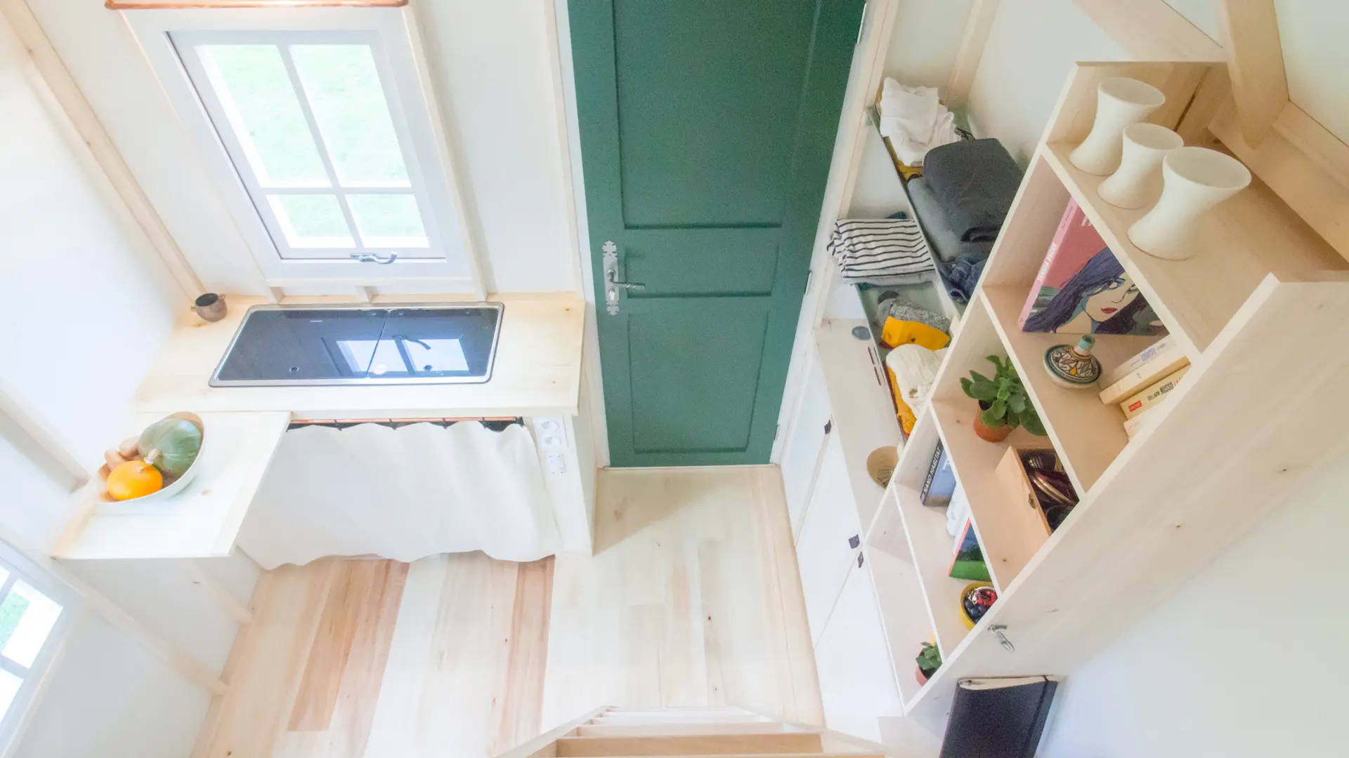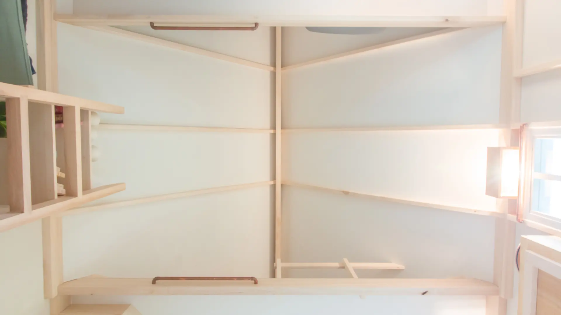 Roof and house frames, floor, foldable table, bench trunk, desk and bookshelf, all made in solid poplar.